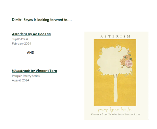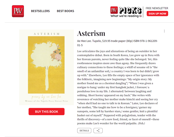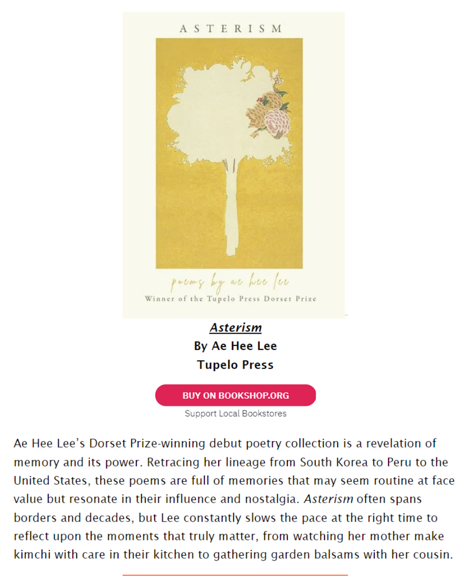 View all 31 Outstanding Poetry Books from 2024 – Alcalá to Zarin, Asterism by Ae Hee Lee (Tupelo), Reviews by David Starkey