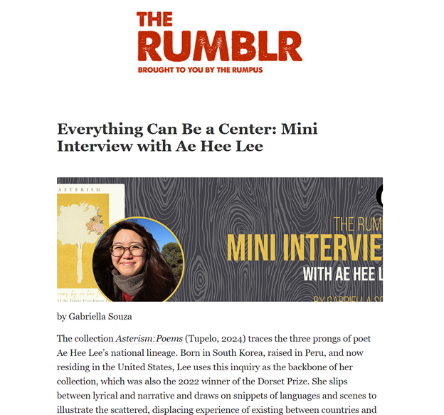 “It’s indicative of the collection that an asterism is a visible pattern of groups of stars in the sky that is more ambiguous—more open—than a constellation. Lee provides a literary asterism in these intimate and sensory poems of memories and languages and revelations, as well as offering a mirror in which to contemplate our own origins, and who and how we are in our own multifaceted, ambiguous lives.”